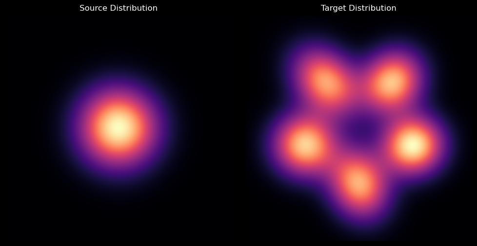 2D visualization of the initial and target distribution.