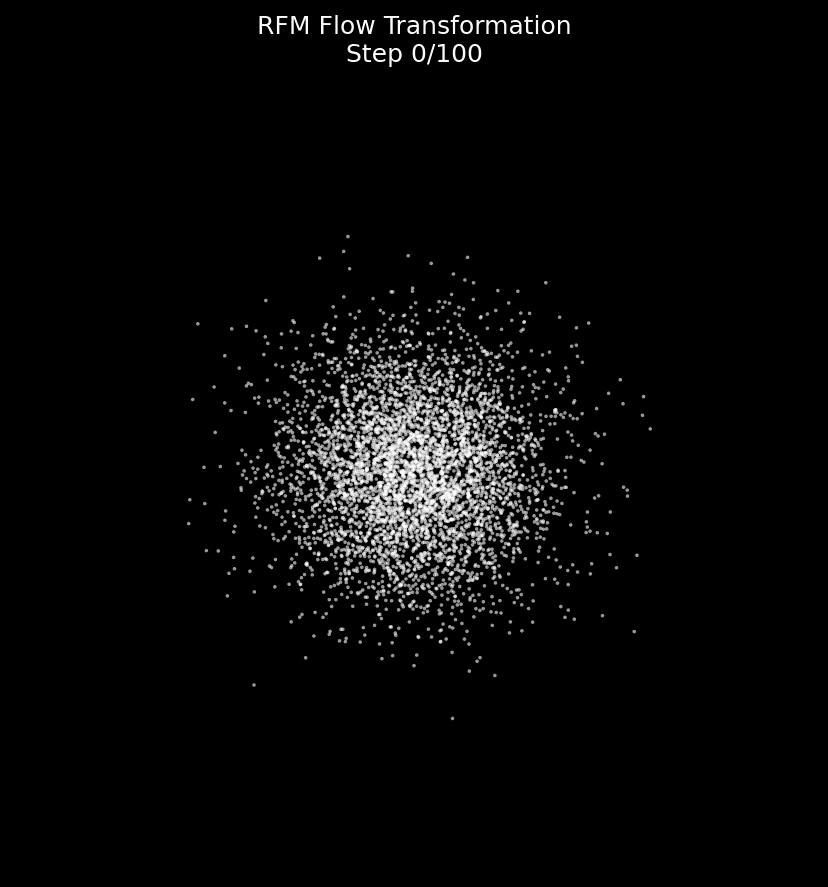 This is where RFM comes in. It is a technique for learning how to transform one distribution (say, “flat noise”) into another (“structured terrain”, for example). RFM achieves this by learning a straightened path between the two distributions. Think of it as guiding each data point along a carefully planned journey.